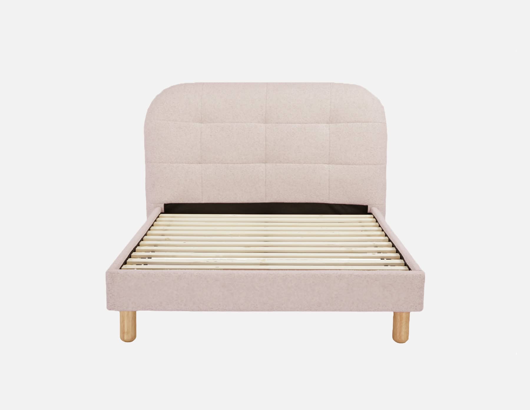 Crafted with solid wood legs and durable solid pine wood slats, the Celine Bed combines elevated design with lasting support. The natural wood details ground the piece with warmth, while the textured bouclé upholstery delivers a modern, high-end aesthetic.