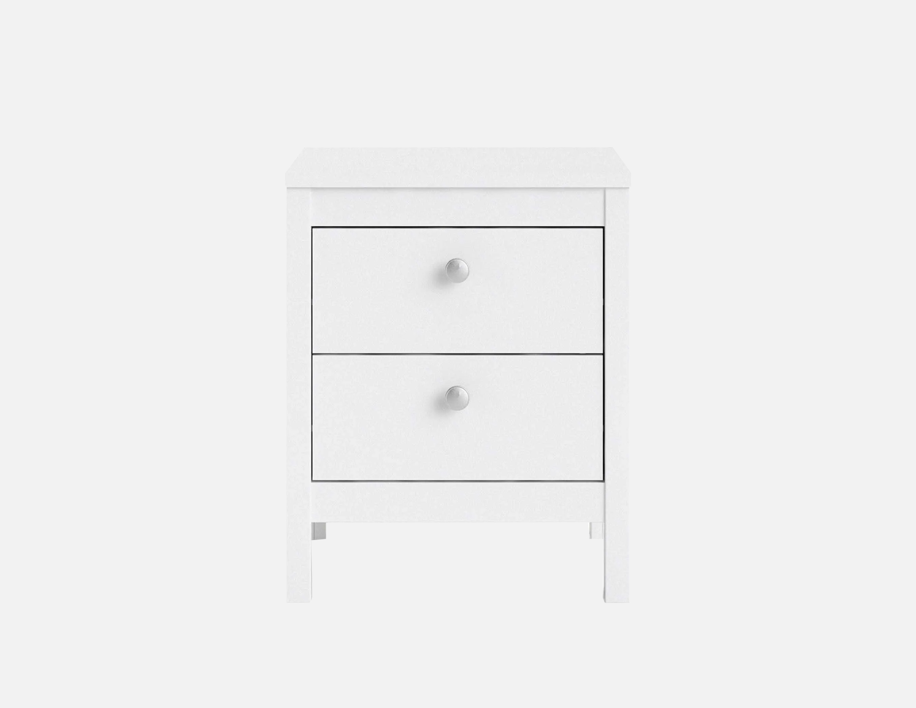 This two-drawer nightstand is made of engineered wood and melamine with a beautiful minimalist design. Boasting of durable construction with scratch and stain-resistant properties, it is well-furnished with a melamine finish too.
