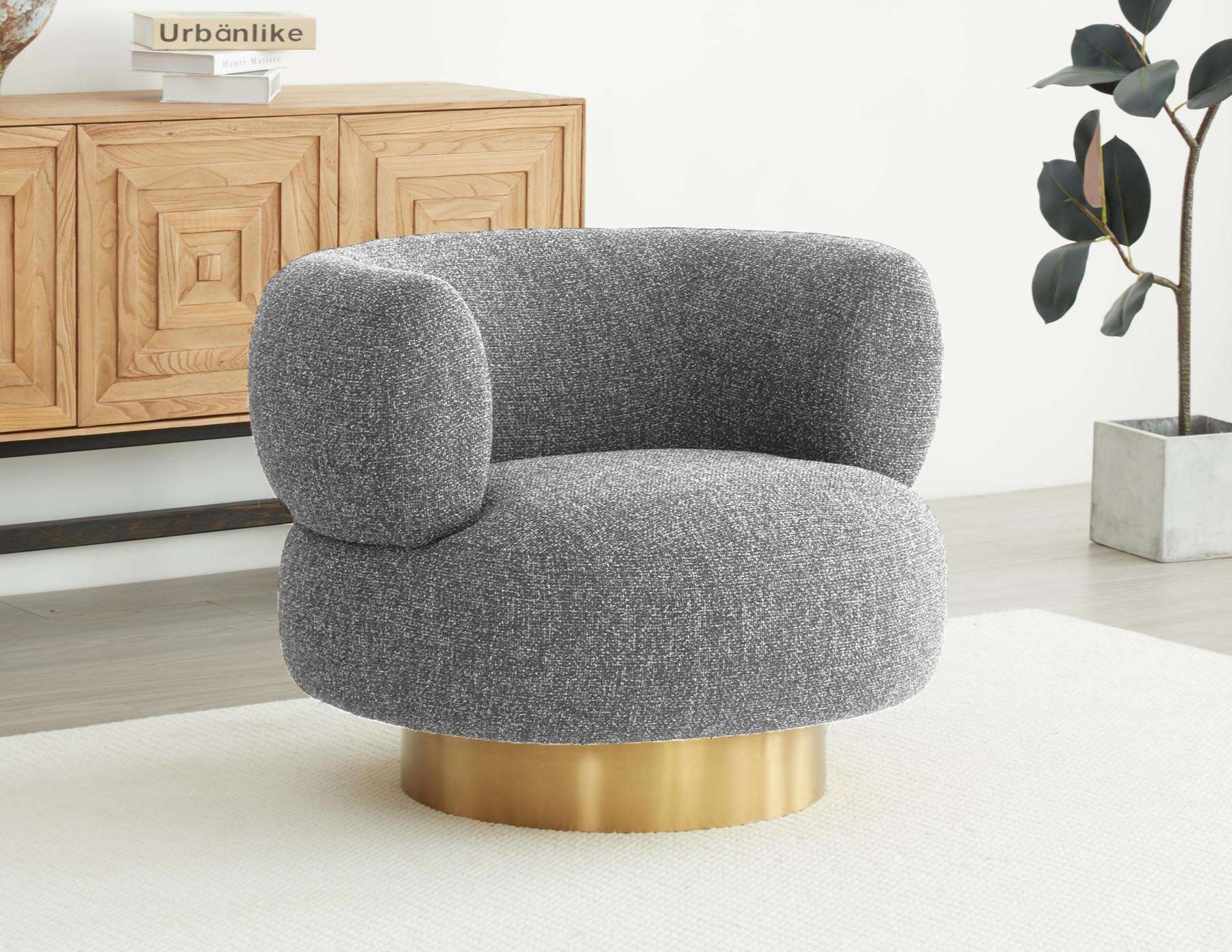 The Viv chair features a rounded barrel-style backrest that gently hugs the body, paired with a spacious seat cushion for relaxed lounging. The textured grey fabric offers versatility, effortlessly complementing modern, contemporary, and minimalist interiors.